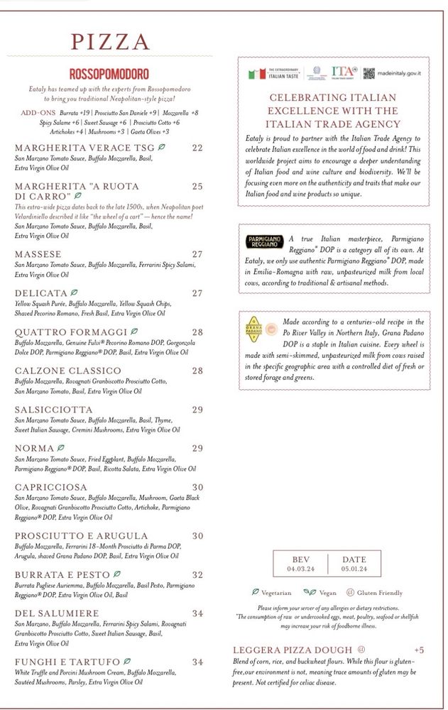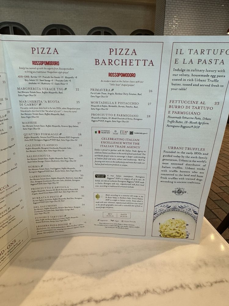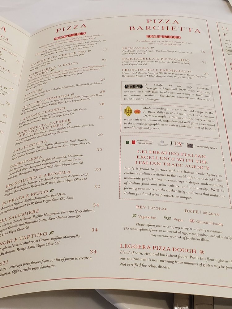 La Pizza E La Pasta at Eataly Las Vegas offers a comfortable venue with delicious Italian food. Customers rave about the Margherita pizza, highlighting its fresh basil, sauce, and mozzarella. The restaurant is easily accessible within Eataly at Park MGM, with friendly and attentive service from servers like Veronica and Elias. The Fettuccine al Burro Di Tartufo e Parmigiano and Calamari Fritti con Zucchini are recommended for their flavorful qualities. The crispy crust of the Margherita Verace TSG pizza is also noted. Overall, the staff excels in customer service, engaging in conversations and ensuring a pleasant dining experience. La Pizza E La Pasta at Eataly Las Vegas is a must-visit for those seeking authentic Italian cuisine in a trendy yet casual setting.